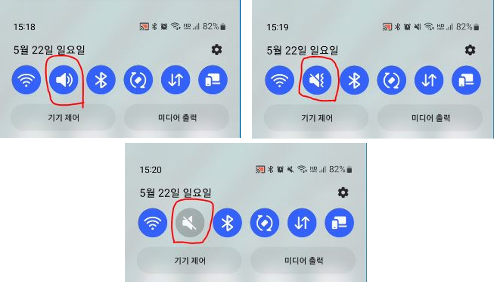 # 화면 맨 위에서 아래로 쓸어내려 상단메뉴를 펼친 후 스피커 모양 터치하면 소리모드 변경 가능합니다.