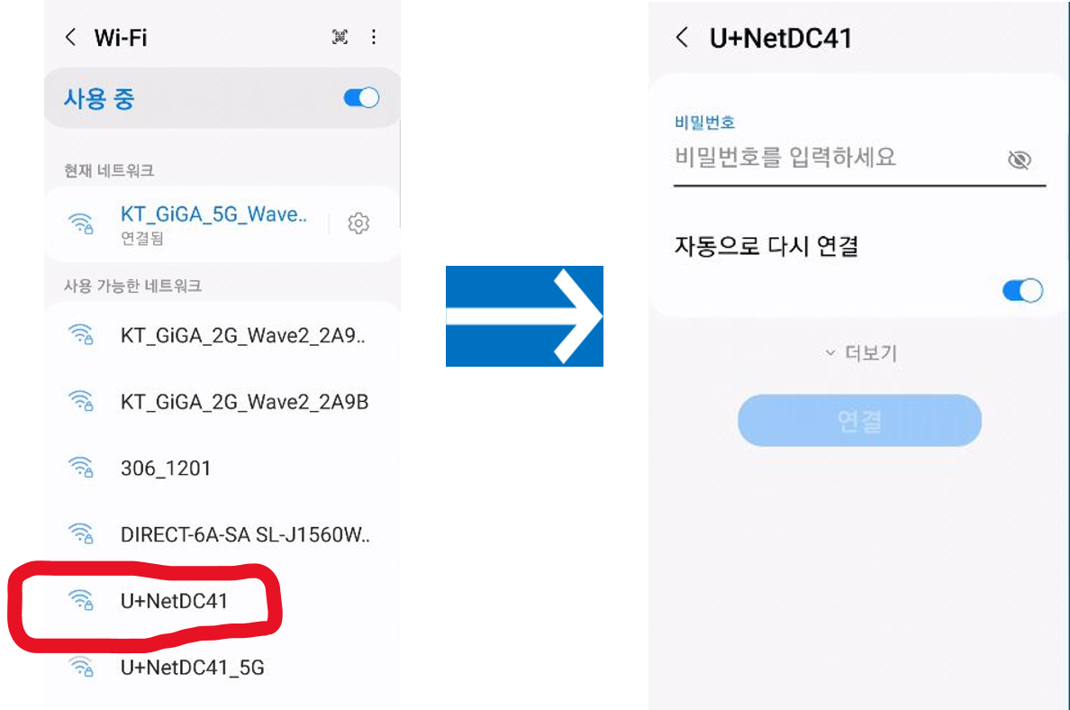 # 와이파이 목록 중 원하는 목록을 선택한 후 비밀번호를 입력하여 와이파이를 활성화합니다.