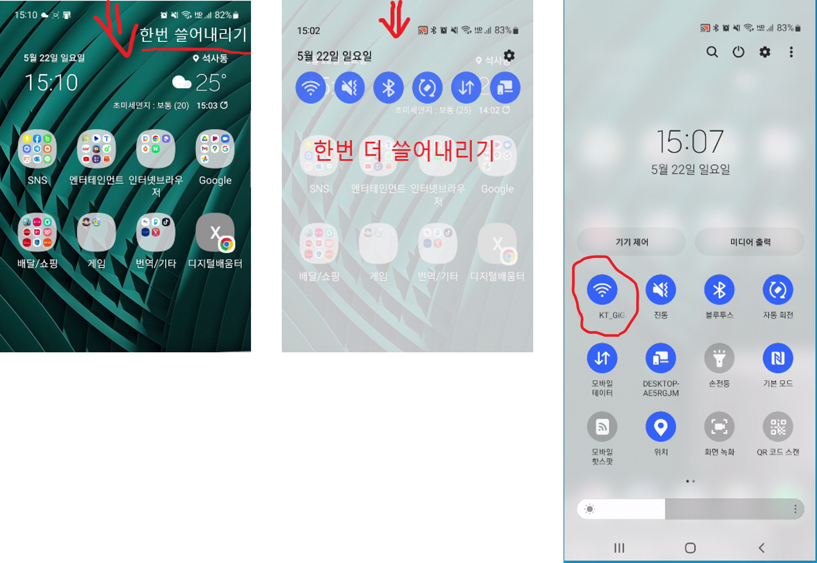 1. 먼저 스마트폰의 홈화면을 터치하여 아래로 쓸어내려 상단메뉴를 펼칩니다.