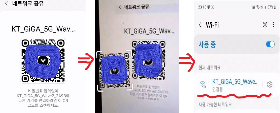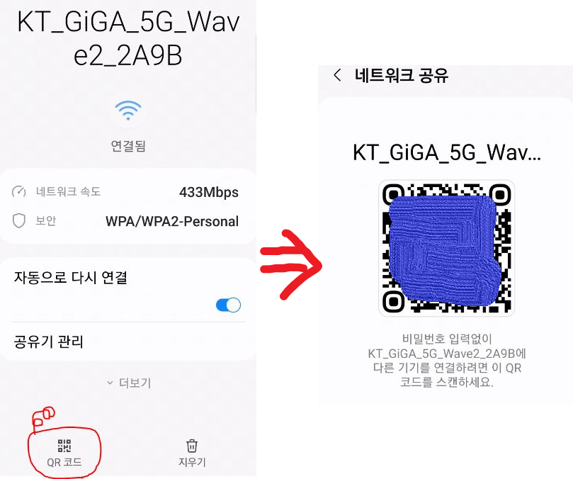 4. 생성된 QR코드를 공유를 하려는 스마트폰으로 QR코드스캔을 하면 와이파이 비밀번호가 공유가 되면서 사용할 수 있게 됩니다.