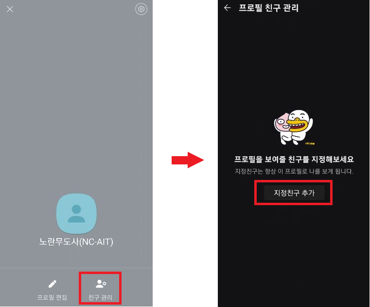 그러면 프로필 친구 관리 화면으로 넘어가고 오른쪽 그림처럼 지정친구 추가 버튼이 보입니다. 그 버튼을 터치합니다.
