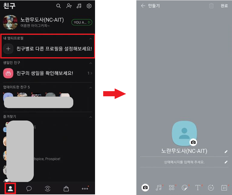 그러다보니 친구들의 관계나 성향에 따라 프로필을 재미있게 만들어 보여줄 수도 있지만 그렇지 않을 때도 있습니다. 이럴 때 사용하는 것이 멀티 프로필 기능입니다. 그럼 프로필을 추가적으로 만드는 방법을 시작하겠습니다.