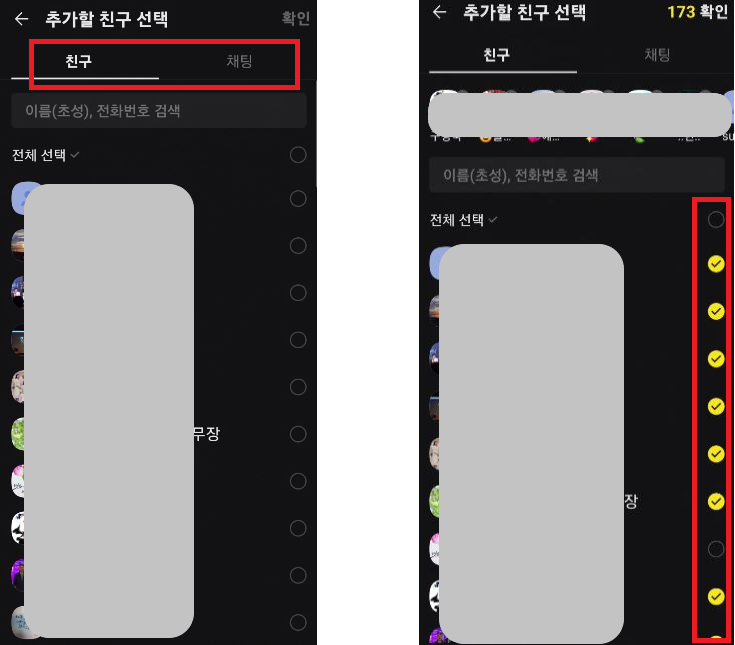 추가할 친구 선택은 왼족 그림상단에 있는 친구목록이나 채팅목록에 있는 친구들을 오늘쪽 그림처럼 선택 할 수 있습니다.