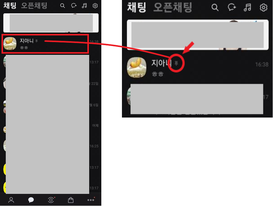 채팅방 이름 오른쪽 옆을 보면 고정핀 모양이 표시되어 있는 것을 확인할 수 있습니다.