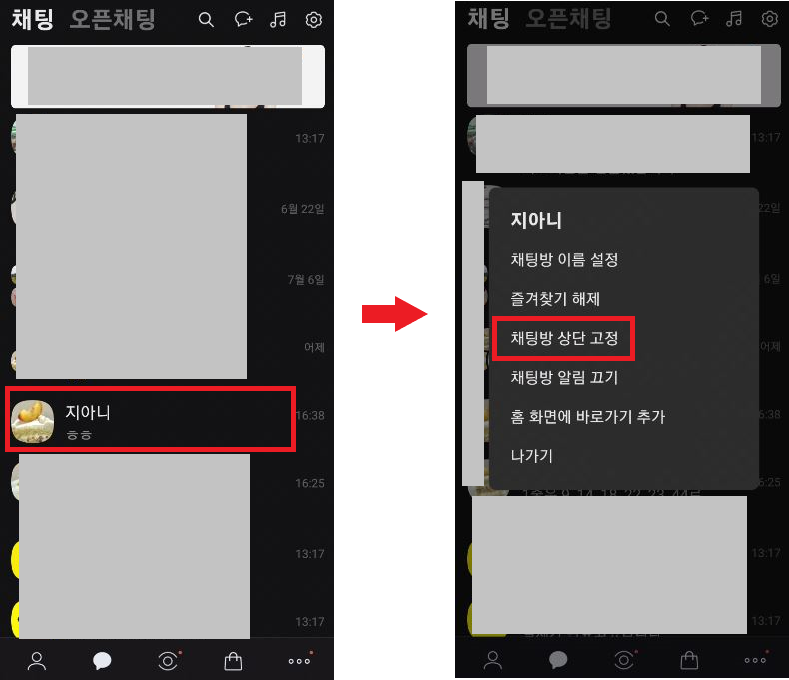 숨은 메뉴가 나오고 메뉴 중 채팅방 상단 고정을 선택합니다.