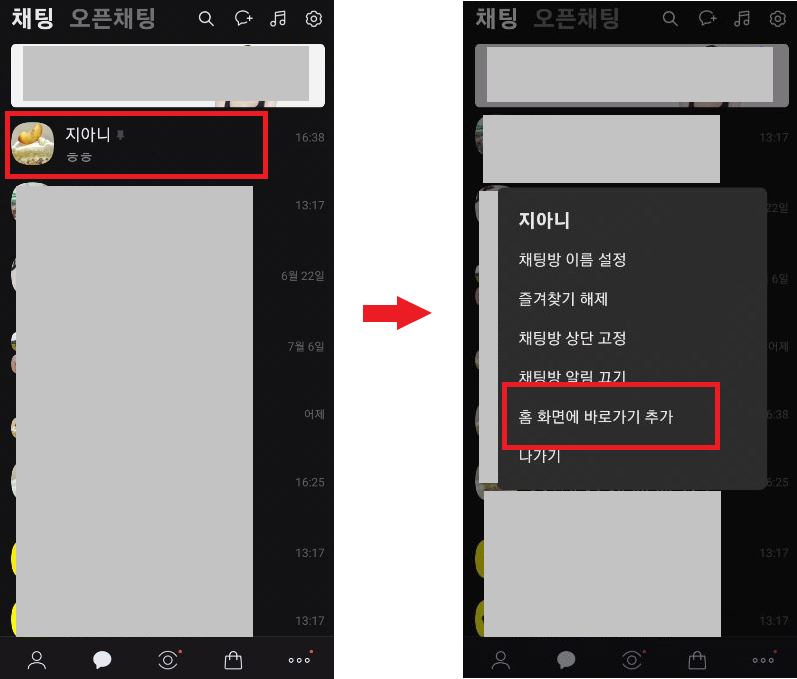 먼저 홈 화면에 추가하고 싶은 채팅방을 찾은 후 길게 터치해줍니다.