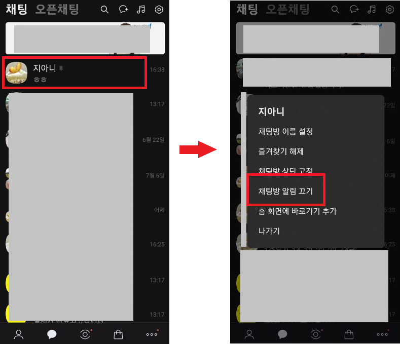 숨은 메뉴가 나오고 메뉴 중 채팅방 알림 끄기를 선택합니다.