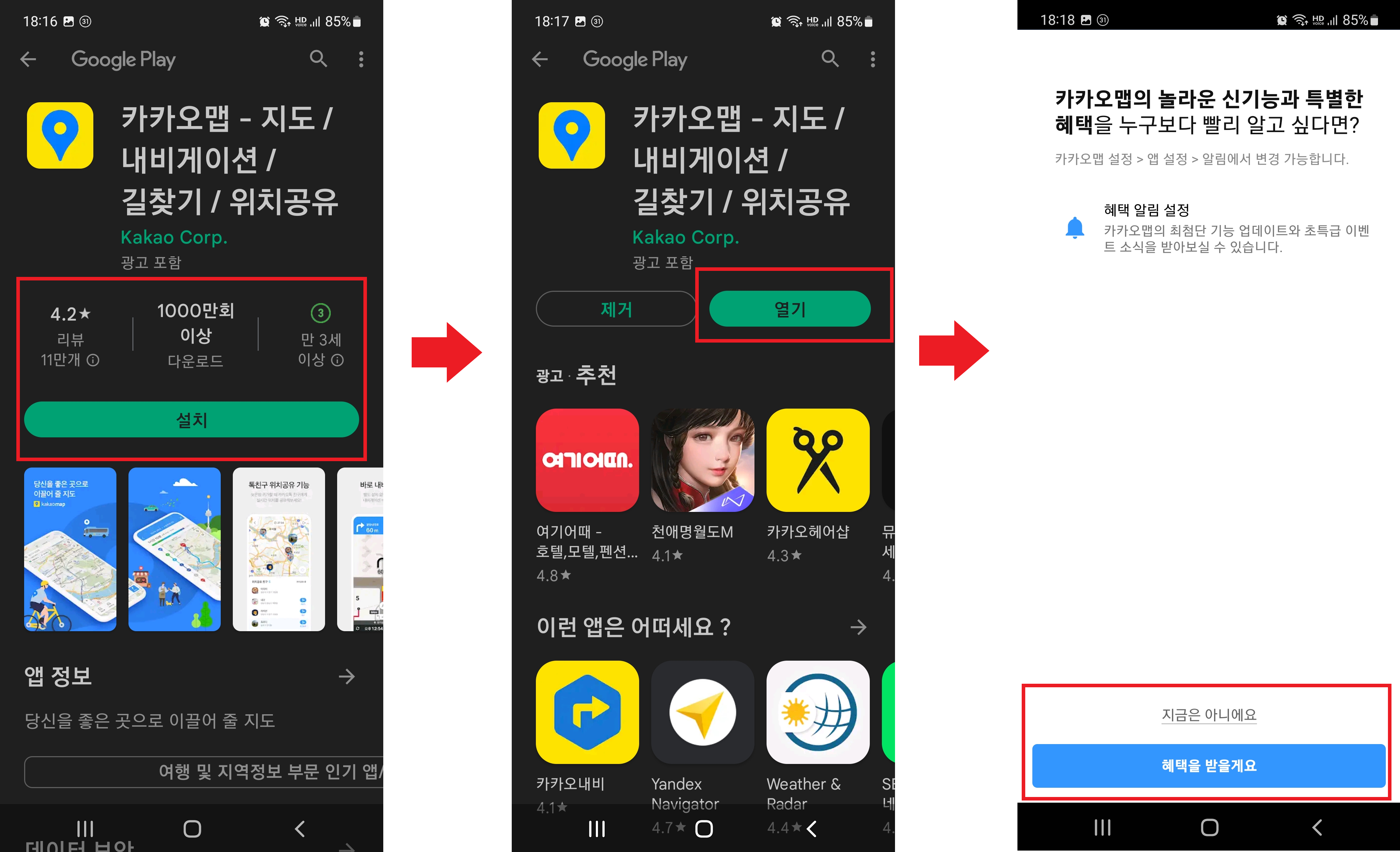 스마트폰에 카카오맵이 설치되어 있는 분은 바로 카카오맵을 사용할 수 있고 없으면 위의 마지막 그림처럼 설치하는 화면이 나옵니다.